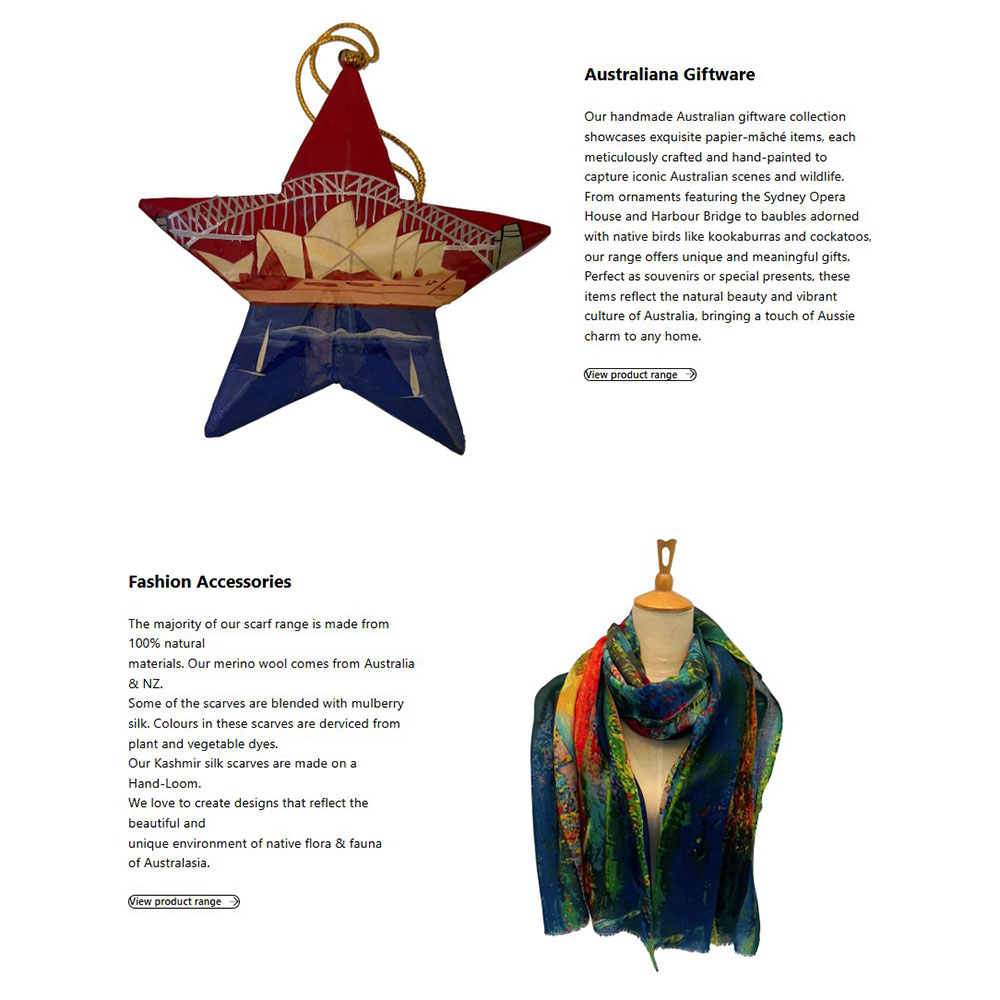 Our own Designed & Manufactured Range of Hand-Painted Decorative Wooden Eggs & Papier Machie Christmas Ornaments in Traditonal Colours & Australiana Themed: Iconic Landmarks, Native Birds & Animals, Flora & Fauna. Beautiful Range of Scarves in Australian Merino Wool, Silk, Cashmere Wool & Cotton. Embroidered Cushions, Wall Hangings & Rugs.