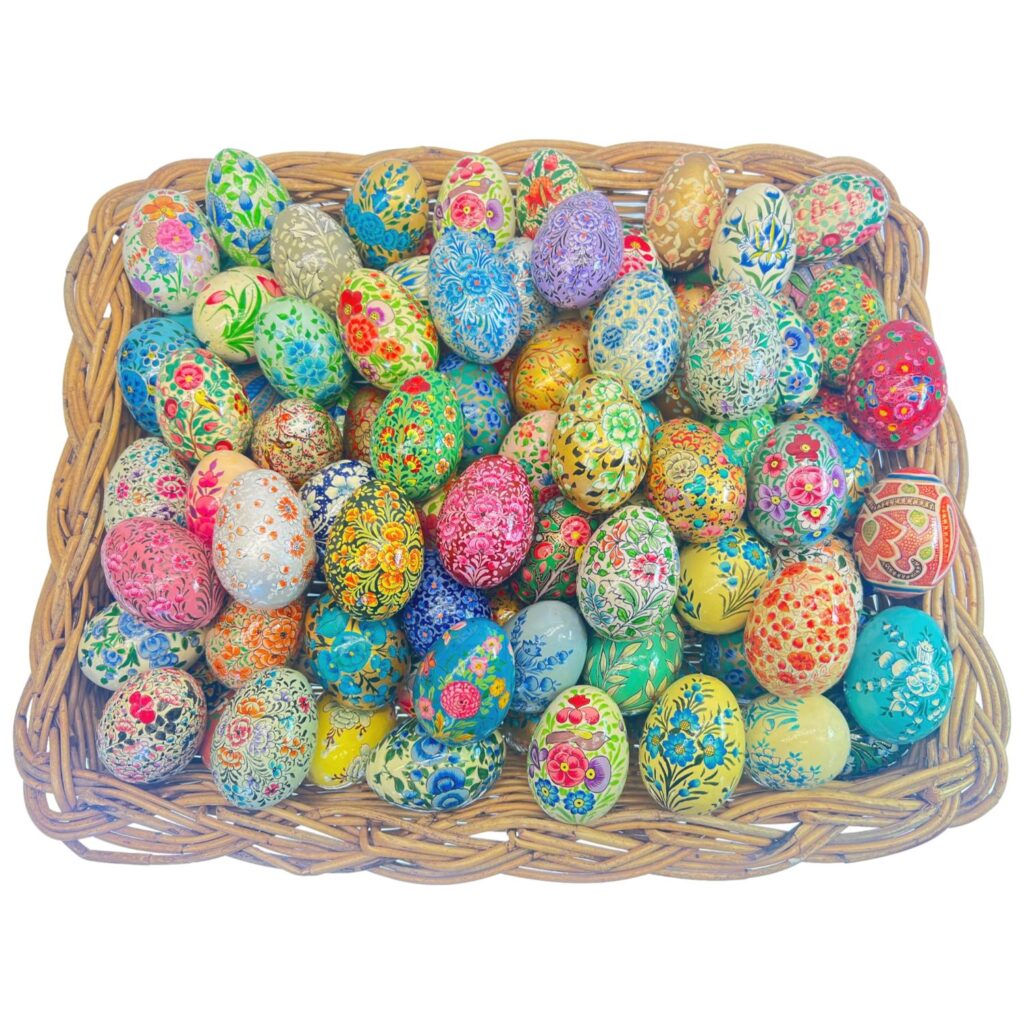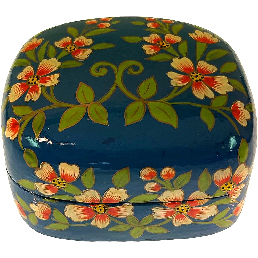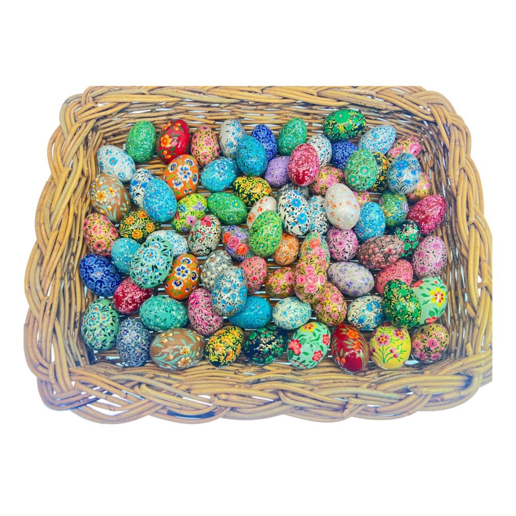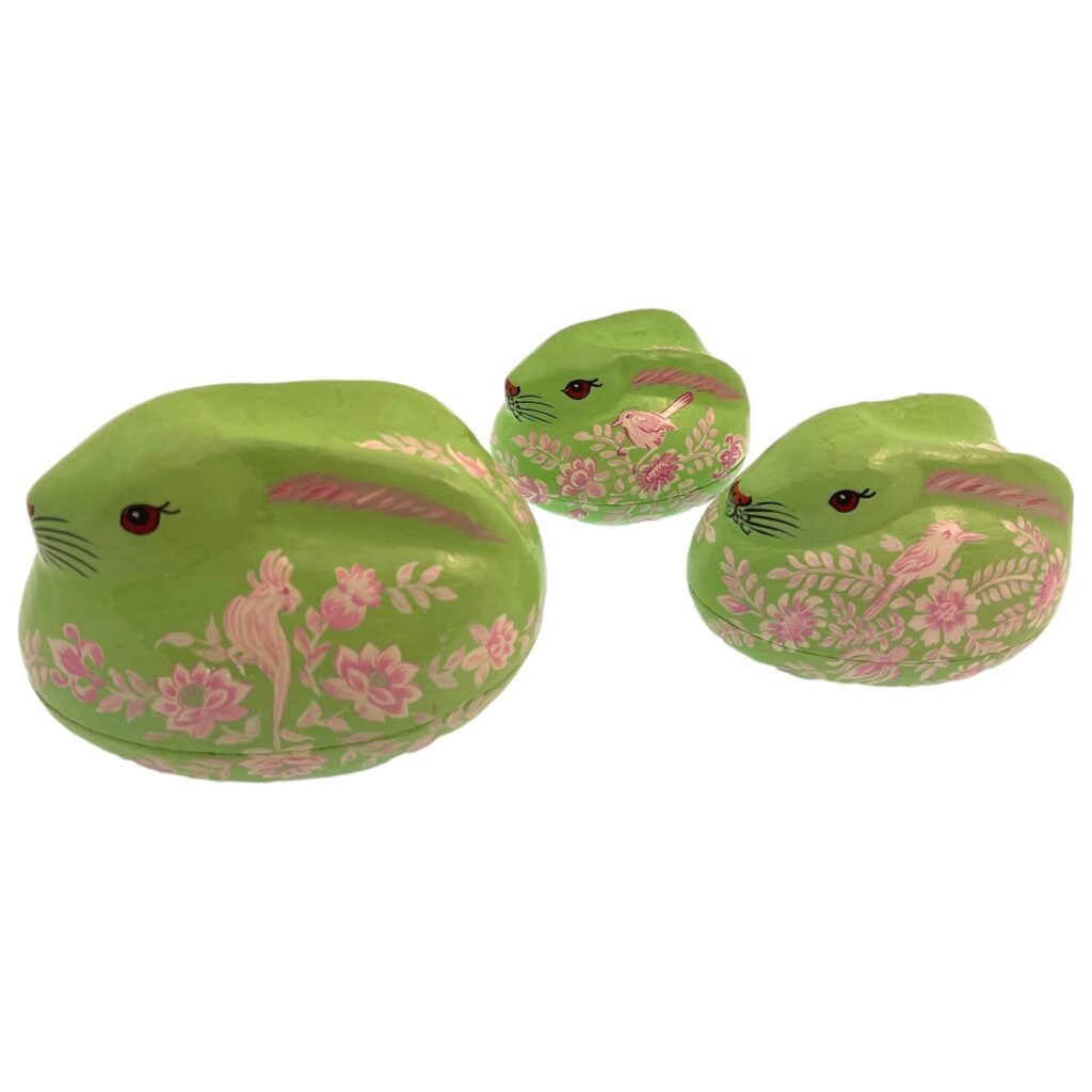 Our Hand Made/Hand Painted Papier Machie items are made from recycled paper products,old sacking,rice flour,old newspapers even tiny branches. All re-usable sources that are made into a pliable pulp, put on a pre made mould of clay or wood. The very long process of Text drying,cutting the desired shape,sanding,various applications of colour design,sun drying again until the final item appears, be it a decorative box, a rabbit or a Christmas bauble. This artform's manufacturing methods haven't changed since our ancestors were creating many beautiful artwork for the Mughal Emperors in the 16th17th Century